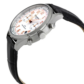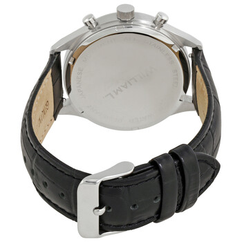 Stainless steel case with a black (crocodile) leather strap. Fixed stainless steel bezel. White dial with luminous rose gold-tone hands and Arabic numeral hour markers. Minute markers. Telemeter markings. Tachymeter markings around the outer rim. Dial Type: Analog. Luminescent hands. Date display between the 4 and 5 o'clock positions. Chronograph - two sub-dials displaying: 60 second and 60 minute. Quartz movement. Scratch resistant mineral crystal. Solid case back. Case size: 40 mm. Case thickness: 10 mm. Round case shape. Band width: 20 mm. Tang clasp. Water resistant at 50 meters / 165 feet. Functions: chronograph, telemeter, tachymeter, date, hour, minute, second. Casual watch style. William L 1985 Vintage Chronograph White Dial Men's Watch WLAC01BCORCN.