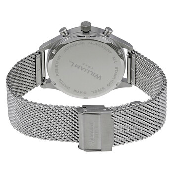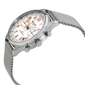 Stainless steel case with a stainless steel mesh bracelet. Fixed stainless steel bezel. White dial with luminous rose gold-tone hands and Arabic numeral hour markers. Minute markers. Telemeter markings. Tachymeter markings around the outer rim. Dial Type: Analog. Luminescent hands. Date display between 4 and 5 o'clock position. Chronograph - two sub-dials displaying: 60 second and 60 minute. Quartz movement. Scratch resistant mineral crystal. Solid case back. Case size: 40 mm. Case thickness: 10 mm. Round case shape. Band width: 20 mm. Fold over clasp. Water resistant at 50 meters / 165 feet. Functions: chronograph, date, hour, minute, second. Dress watch style. William L 1985 Vintage Chronograph White Dial Men's Watch WLAC01BCORMM.