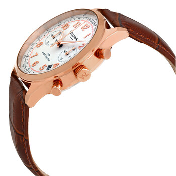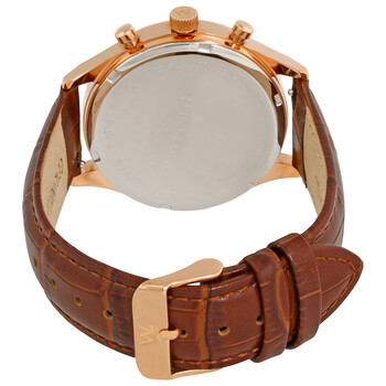Rose gold-plated stainless steel case with a brown leather strap. Fixed rose gold-plated bezel. White dial with luminous rose gold-tone hands and Arabic numeral hour markers. Minute markers. Telemeter markings. Tachymeter markings around the outer rim. Dial Type: Analog. Date display between the 4 and 5 o'clock positions. Chronograph - two sub-dials displaying: 60 second and 60 minute. Miyota caliber 6S21 quartz movement. Scratch resistant mineral crystal. Screw down crown. Solid case back. Round case shape. Case size: 40 mm. Case thickness: 10 mm. Band width: 20 mm. Tang clasp. Water resistant at 50 meters / 165 feet. Functions: chronograph, tachymeter, telemeter, date, hour, minute, second. Dress watch style. Watch label: Japan Movt. William L 1985 Vintage Chronograph White Dial Men's Watch WLOR01BCORCM.
