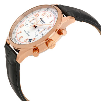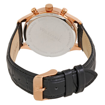 Rose gold-plated stainless steel case with a black (alligator) leather strap. Fixed rose gold-plated bezel. White dial with luminous rose gold-tone hands and Arabic numeral hour markers. Minute markers. Telemeter markings. Tachymeter markings around the outer rim. Dial Type: Analog. Luminescent hands. Date display between the 4 and 5 o'clock positions. Chronograph - two sub-dials displaying: 60 second and 60 minute. Miyota caliber 6S21 quartz movement. Scratch resistant mineral crystal. Screw down crown. Solid case back. Round case shape, case size: 40 mm, case thickness: 10 mm. Band width: 20 mm. Tang clasp. Water resistant at 50 meters / 165 feet. Functions: chronograph, tachymeter, telemeter, date, hour, minute, second. Dress watch style. Watch label: Japan Movt. William L 1985 Vintage Chronograph White Dial Men's Watch WLOR01BCORCN.