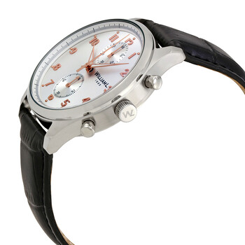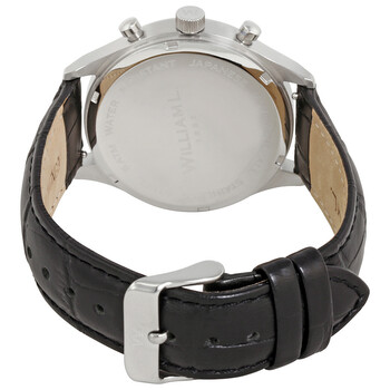 Silver-tone stainless steel case with a black leather strap. Fixed silver-tone stainless steel bezel. Silver dial with silver-tone hands and Arabic numeral hour markers. Dial Type: Analog. Luminescent hands. Chronograph - two sub-dials displaying: 60 second and 60 minute. Quartz movement. Scratch resistant mineral crystal. Solid case back. Case size: 40 mm. Case thickness: 11 mm. Round case shape. Band width: 20 mm. Water resistant at 50 meters / 165 feet. Functions: chronograph, hour, minute, second. Dress watch style. William L. 1985 Vintage Silver Dial Men's Chronograph Black Leather Watch WLAC02GOCN.