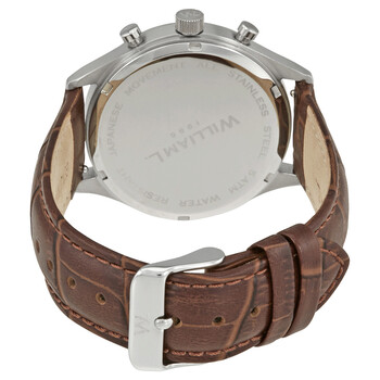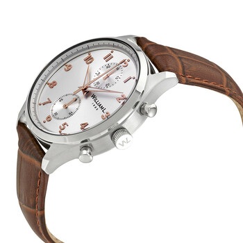 Silver-tone stainless steel case with a brown leather strap. Fixed silver-tone stainless steel bezel. Silver dial with rose gold-tone hands and Arabic numeral hour markers. Dial Type: Analog. Luminescent hands. Chronograph - two sub-dials displaying: 60 second and 60 minute. Quartz movement. Scratch resistant mineral crystal. Solid case back. Case size: 40 mm. Case thickness: 11 mm. Round case shape. Band width: 20 mm. Water resistant at 50 meters / 165 feet. Functions: chronograph, hour, minute, second. Dress watch style. William L. 1985 Vintage Silver Dial Men's Chronograph Brown Leather Watch WLAC02GOCM.