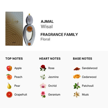 As a creation of the renowned Middle Eastern design house, Ajmal, Wisal stands out with its sophisticated composition. This delightful fragrance opens with a burst of refreshing top notes, including ripe Apple, juicy Peach, and crisp Pear, intertwined with the zesty brightness of Grapefruit and Mandarin. These invigorating scents set the stage for a heart of pure floral splendor, where the timeless elegance of Rose, Jasmine, and Orchid mingles with the delicate charm of Geranium.