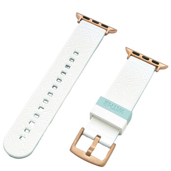 White silicone strap. Item Variations: WI/T-AC3-08-158-BX-01. WITHit Apple Compatible Unisex Adult White Watch Band. Watch Band Length: 7 1/2 Inch. Band Width: 20mm. Jewelry Closure: Buckle.