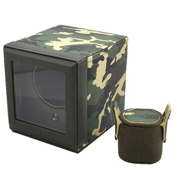 Wolf Elements Single Winder - Earth. Drawing inspiration from the world around us, Elements uses colour and pattern in a contemporary design. Be inspired by the true aesthetics of nature, choose from the blues of Water, orange and magenta of Fire or greens and browns of Earth. Add a touch of flair to your home with the Elements Single Cub Watch Winder. Lock-In Cuff: Patented lock-in cuff ‘locks’ your timepiece into the rotator drum for a secure fit. Low density foam to accommodate all wrist sizes without putting pressure on your bracelet. Exclusive: Return to start - Your watch will return to the position it started in when the cycle has completed. Size: 5.25" L x 6.25" W x 5.75" H. Material: Vegan Leather.