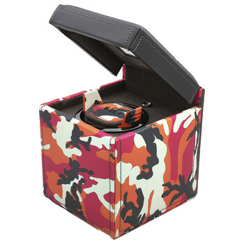 Wolf Elements Single Winder - Fire. Drawing inspiration from the world around us, Elements uses colour and pattern in a contemporary design. Be inspired by the true aesthetics of nature, choose from the blues of Water, orange and magenta of Fire or greens and browns of Earth. Add a touch of flair to your home with the Elements Single Cub Watch Winder. Lock-In Cuff: Patented lock-in cuff ‘locks’ your timepiece into the rotator drum for a secure fit. Low density foam to accommodate all wrist sizes without putting pressure on your bracelet. Exclusive: Return to start - Your watch will return to the position it started in when the cycle has completed. Size: 5.25" L x 6.25" W x 5.75" H. Material: Vegan Leather.