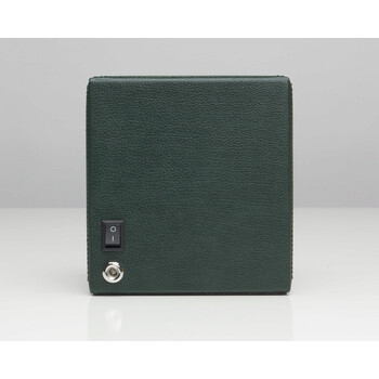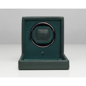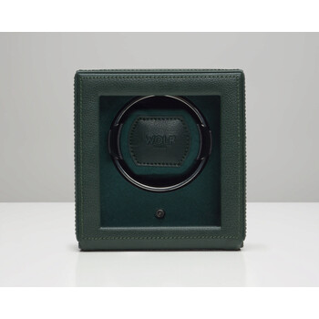 A meticulously engineered watch winder with a sharp design, the Cub includes a green Pebble finish, glass cover, green grosgrain faceplate, chrome finished hardware and a single winding module. Dimensions: 5.25'W X 6'D X 5.75'H Features: Rotation: 10 second start delay, 900 TPD (Turns Per Day), patented rotation programs - Intermittent rotation with pause and sleep phases pre-programmed.