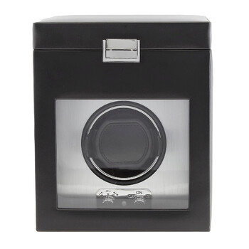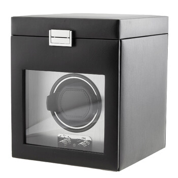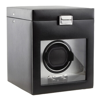 This winder features brushed metal faceplate, 1 winding module, 2 piece watch storage, glass cover, chrome finished hardware and lock in cuff. It has battery power Option with Universal Power Adapter. Wolf Heritage Single Winder.