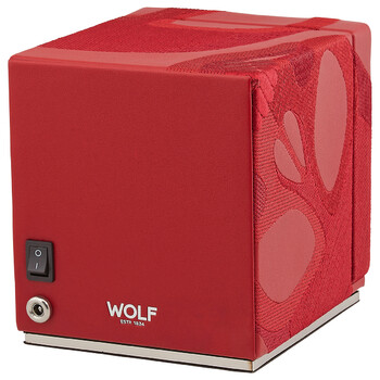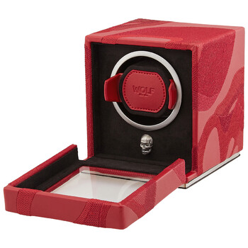 The "Memento Mori" Collection by Wolf is part of the cub series and derives from the Latin term that symbolizes the inevitability of death, hence the skull references. This unique and stylish single watch winder has a textured embroidered skull pattern exterior with smooth leatherette accents. The flip down glass covered frame has chrome hardware with a skull emblem LED light that changes colors. The interior is lined with an ultra-soft suede LusterLoc™ tarnish free material with a large removable cuff to accommodate watches up to 52mm in size. The winder is battery operated with an optional AC power adapter with a bi-directional 900 TPD (turns per day) program with sleep and pause modes.