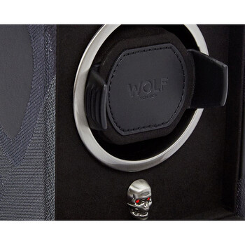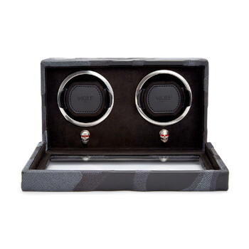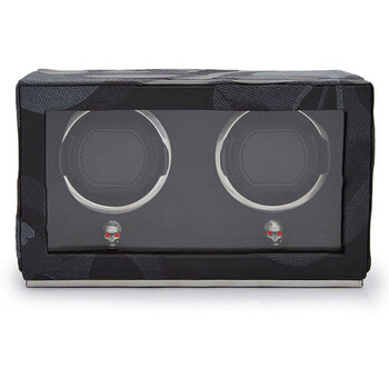 WOLF Watch Winder Memento Mori Cub Double Black 493202. The Memento Mori double cub watch winder is hand crafted in smooth vegan leather with skull embroidery, brushed chrome skull hardware with LED lights changing from white to red and ultrasuede lining. Includes brushed chrome skull hardware and two winding modules. Size: 10 x 6 x 6 inches. Black faux leatherette exterior with skull embroidered pattern Glass cover. Black ultra-suede interior lining. Polished chrome silver hardware. Pre-programmed. 10 second start delay. 900 TPD (Turns Per Day). Bi-directional. Intermittent rotation with pause and sleep phases pre-programmed.