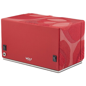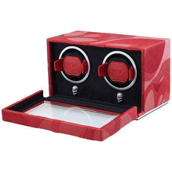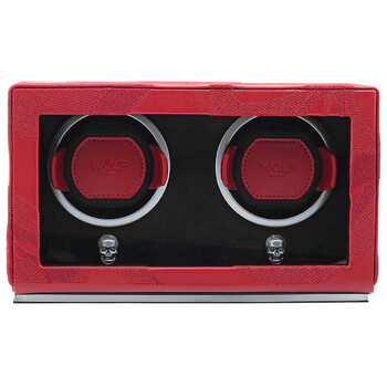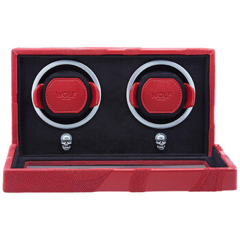 The "Memento Mori" Collection by Wolf is part of the cub series and derives from the Latin term that symbolizes the inevitability of death, hence the skull references. This unique and stylish double watch winder has a textured embroidered skull pattern exterior with smooth leatherette accents. The flip down glass covered frame has chrome hardware with a skull emblem LED lights that changes colors. The interior is lined with an ultra-soft suede LusterLoc™ tarnish free material with a large removable cuff to accommodate watches up to 52mm in size. The winder is battery operated with an optional AC power adapter with a bi-directional 900 TPD (turns per day) program with sleep and pause modes.