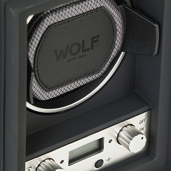 This compact, stackable Wolf watch winder is made of black carbon fiber, glass, and aerospace-grade aluminum. It features a backlit LCD display, a locking cuff that accomodates bracelets larger than 10" long, and the ability to interlock with other winders to create a multiple winder system. It runs off an included 5V power adapter. Rotation options include customizable settings, from 300-1200 rotations, clockwise, counterclockwise, and bidirectional turning, and different increments of delay, for 57 different programming options. Measures 6"H x 4.75"W x 5.75" D.