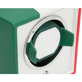 The Navigator Collection by Wolf is part of the Cub Series, an affordable solution to quality, entry level watch winders. Inspired by the world traveler and paying homage to the flags of the world, the navigator features patriotic, colorful designs. Made with faux leather, the Mexican flag and its red, white, and green motif beautifully adorn the exterior case. The open frame has an interior of grosgrain fabric lining accented with polished chrome fittings. A large micro-suede, removable cuff will accommodate watches up to 52mm in size. Equipped with a indicator on/off light and powered by batteries with an optional AC power adapter. Program your winding system with bi-directional 900 TPD (turns per day) with sleep and pause modes. The shape and design allows you to add additional cubbies to stack and suit your needs as your collection grows with an eye-catching, colorful way to keep your automatic watches wound and set. Red, white and green leatherette exterior. Grosgrain interior fabric lining. Micro-suede cuff. Polished chrome hardware. Power Source: AA alkaline or lithium batteries. Optional A/C universal power adapter. Winding Operation: Programmable. 10 second start delay, 900 TPD (Turns Per Day). Bi-directional. Intermittent rotation with pause and sleep phases pre-programmed. Storage: Single watch winders. Watch Holder. Compressible padded patented lock in cushion cuff. Max. Dia. Of Watch (including Crown). Up to 52 mm. Dimensions: 5.25 x 4.5 x 5.75 inches.