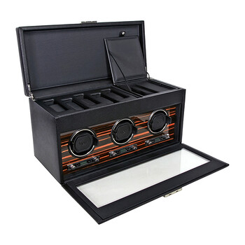 This Wolf triple watch winder is made of polished ebony Macassar wood, chrome-plated fittings, and black pleather. Lock-in cuff accomodates bracelets longer than 10". A backlit LCD display provides a countdown of rotations in the cycle. A fully customizable rotation program allows for between 300-1200 turns per day, clockwise, counterclockwise, and bi-directional turning, and different increments for delay, for up to 57 different programming combinations. Runs on an included 3.3V adapter or D batteries. Measures 18" L X 8" W X 9" H. Unique design allows for multiple winders to connect and run off a single power source. Plus, winder includes space to store three watches.