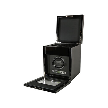 Wood frame construction, black piano veneer exterior, chrome hardware and black silk fabric lining. Rotation options: clockwise, counter-clockwise, and bi-directional. Turns per day options from 300-1200 in increments of 50. Start delay options from 6 hours up to 72 hours. Runs on either 3.3V AC power adapter (included) or D-cell batteries. Dimensions: 8 inches W x 10 1/4 inches H x 8 inches D.