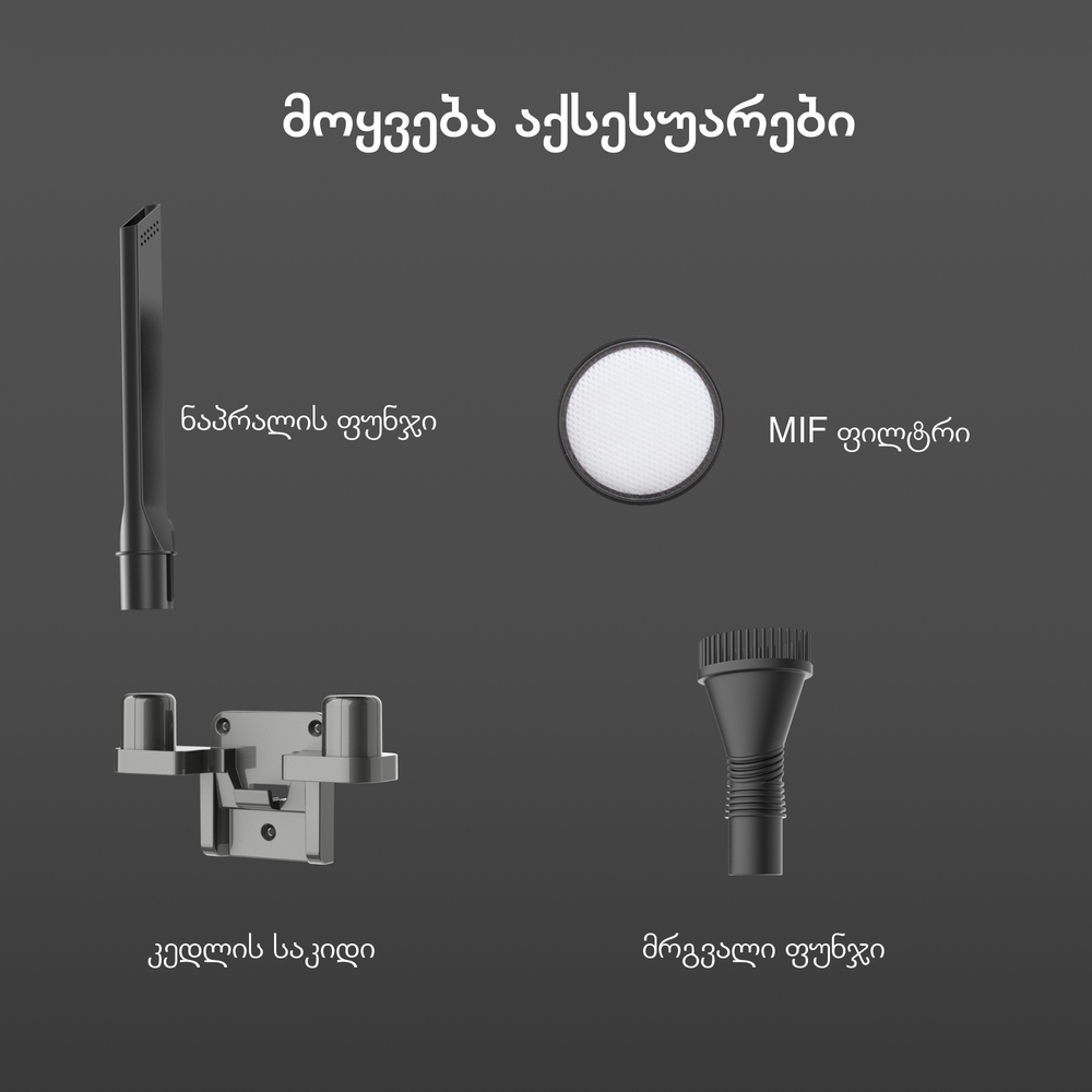 მტვერსასრუტს აქვს ერგონომიული დიზაინი, კომპლექტაციაშია საკიდი მტვერსასრუტისა და აქსესუარებისთვის და თავაკები, რომლებიც შეგიძლიათ გამოიყენოთ ავეჯის, ხალიჩის, მანქანის სალონისა და სხვადასხვა ზედაპირის დასუფთავებისთვის. ფუნქციური დიზაინი საშუალებას გაძლევთ მარტივად შეცვალოთ დასუფთავების კუთხე 90° -დან 180°-მდე, რაც ამარტივებს რთულად მისადგომი ადგილების სადუფთავებას.