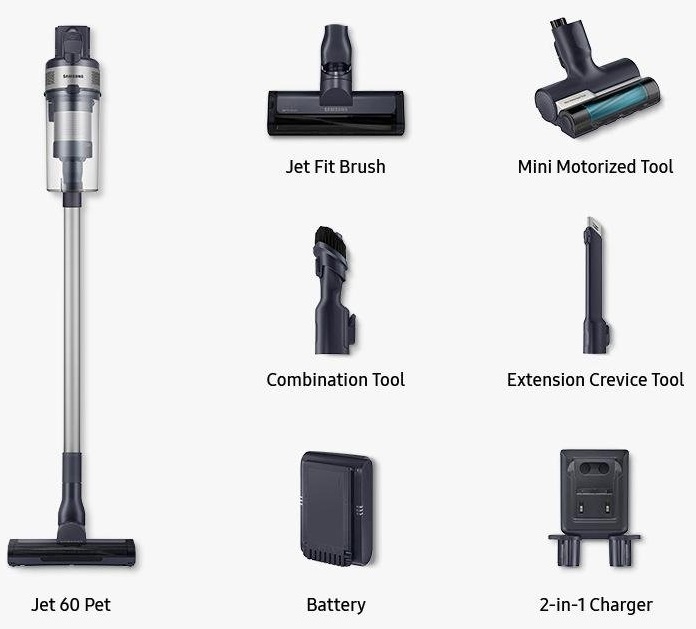 ხელის მტვერსასრუტი Samsung JET 60 VS15A6031R5/EV აღჭურვილია 21.6 V Li-Ion ელემენტით, რომლის მეშვეობითაც ერთი დამუხტვით მოწყობილობა მუშაობს 40 წუთამდე.