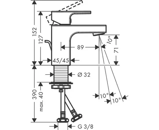 ხელსაბანის შემრევი Hansgrohe 71560670 (შავი) გამორჩეულია კომპაქტური და ელეგანტური დიზაინით – დაკეტილ მდგომარეობის სიმაღლეა 127 მმ, მოშვებულ – 152 მმ. აღჭურვილია G3/8" შეერთებით და 86 მმ მილით. კორპუსის დიამეტრი – 32 მმ.