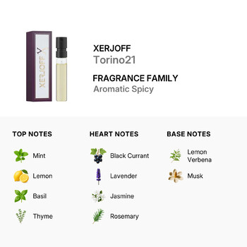 Torino21 opens with a vibrant burst of mint, lemon, basil, and thyme—an energizing combination that awakens the senses. As it settles, the heart reveals a rich blend of black currant, lavender, jasmine, and rosemary, giving the fragrance a smooth, herbal warmth. The base notes of lemon verbena and musk bring a soft, lasting finish that’s both clean and comforting, leaving a memorable impression throughout the day.