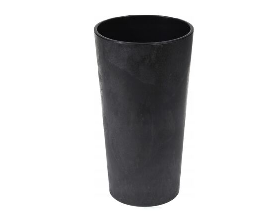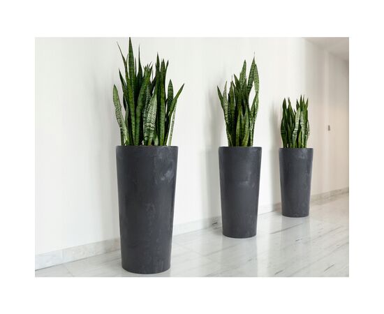 მაღალი პლასტმასის ქოთანი Lilia ბეტონის ეფექტით რეციკლირებული პლასტმასისგან. ქოთანს აქვს კონუსური ფორმა და მოხსნადი შავი პლასტმასის კაშპო. კომპლექტში შედის კაშპო, რომელიც უზრუნველყოფს მცენარეების სათანადო დატენიანებას და ამცირებს ნიადაგის მოხმარებას.