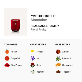 The scent opens with a lively burst of peach, grapefruit, and pink pepper, creating a fresh and uplifting atmosphere. At its heart, delicate floral tones of freesia, iris, rose, and jasmine bloom, adding a soft and romantic touch. The candle finishes with warm base notes of amber, patchouli, cedarwood, and tobacco, giving your space a cozy, lasting aroma that lingers beautifully.