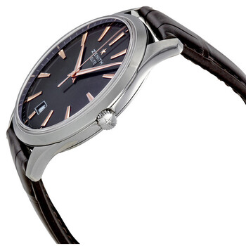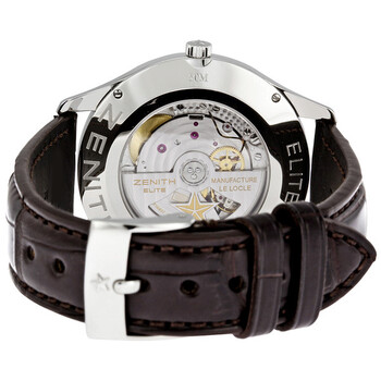 Stainless steel case with a brown leather strap. Fixed stainless steel bezel. Brown dial with luminous rose gold-tone hands and index hour markers. Minute markers around the outer rim. Dial Type: Analog. Luminescent hands and markers. Date display at the 6 o'clock position. Zenith Calibre Elite 670 automatic movement with about 50 hours of power reserve. Scratch resistant sapphire crystal. Solid case back. Case size: 40 mm. Case thickness: 9 mm. Round case shape. Band width: 20 mm. Tang clasp. Water resistant at 50 meters / 165 feet. Functions: date, hour, minute, second. Dress watch style. Watch label: Swiss Made. Zenith Captain Brown Dial Brown Leather Strap Automatic Men's Watch 03206067076C498.