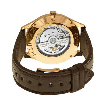18kt rose gold case with a brown (alligator) leather strap. Fixed 18kt rose gold bezel. White dial with rose gold-tone dauphine-style hands and index hour markers. Minute markers around the outer rim. Dial Type: Analog. Date display at the 6 o'clock position. Zenith calibre Elite 670 automatic movement, based upon Zenith Elite 680, containing 27 Jewels, composed of 144 parts, bitting at 28800 vph, and has a power reserve of approximately 50 hours. Scratch resistant sapphire crystal. Pull / push crown. Transparent see through case back. Round case shape. Case size: 40 mm. Case thickness: 9 mm. Band width: 20 mm. Band length: 8.5 inches. Tang clasp. Water resistant at 50 meters / 165 feet. Functions: date, hour, minute, second. Captain Central Second Series. Luxury watch style. Watch label: Swiss Made. Item Variations: 18 2020 670/11 C498, 18-2020-670/11-C498, 18/2020/670/11/C498, 182020670/11C498. Zenith Captain Central Second 18kt Rose Gold Men's Watch 18.2020.670/11.C498.
