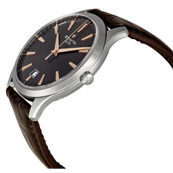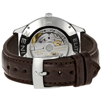 Stainless steel case with a brown (alligator) leather strap. Uni-directional rotating stainless steel bezel. Brown dial with rose gold-tone hands and index hour markers. Minute markers around the outer rim. Dial Type: Analog. Date display at the 6 o'clock position. Zenith calibre Elite 670 automatic movement, based upon Zenith Elite 680, containing 27 Jewels, composed of 144 parts, bitting at 28800 vph, and has a power reserve of approximately 50 hours. Scratch resistant sapphire crystal. Pull / push crown. Skeleton case back. Round case shape. Case size: 40 mm. Case thickness: 9 mm. Band width: 20 mm. Band length: 7 inches. Tang clasp. Water resistant at 50 meters / 165 feet. Functions: date, hour, minute, second. Captain Series. Luxury watch style. Watch label: Swiss Made. Zenith Captain Central Second Men's Watch 03202067076C498.
