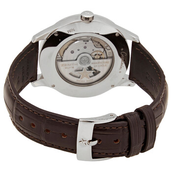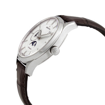 Stainless steel case with a brown leather strap. Fixed stainless steel bezel. Silver dial with silver-toned hands and index hour markers. Minute markers around the outer rim. Dial Type: Analog. Date display between 1 and 2 o'clock position. Two sub-dials displaying: 60 second and moonphase. Zenith calibre Elite 691 automatic movement with a 50-hour power reserve. Scratch resistant sapphire crystal. Pull / push crown. Skeleton case back. Case diameter: 40 mm. Case thickness: 10.35 mm. Round case shape. Tang clasp. Water resistant at 50 meters / 165 feet. Functions: date, hour, minute, second and moonphase. Luxury watch style. Watch label: Swiss Made. Item Variations: 03 2143 691/01 C498, 03-2143-691/01-C498, 03/2143/691/01/C498, 032143691/01C498. Zenith Captain Moonphase Silver Dial Automatic Men's Watch 03214369101C498.