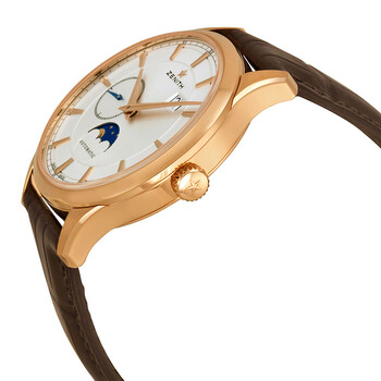 18kt rose gold case with a brown alligator leather strap. Fixed 18kt rose gold bezel. Silver dial with gold-toned hands and index hour markers. Minute markers around the outer rim. Dial Type: Analog. Date display between 1 and 2 o'clock position. Two sub-dials displaying: 60 second and moonphase. Automatic movement with a 50-hour power reserve. Scratch resistant sapphire crystal. Case diameter: 40 mm. Case thickness: 10.35 mm. Round case shape. Band length: 8.5 inches. Tang clasp. Water resistant at 50 meters / 165 feet. Functions: hour, minute, second,and moonphase. Luxury watch style. Watch label: Swiss Made. Item Variations: 18 2143 691/01 C498, 18-2143-691/01-C498, 18/2143/691/01/C498, 182143691/01C498. Zenith Captain Moonphase Silver Dial 18kt Rose Gold Men's Watch 18214369101C498.
