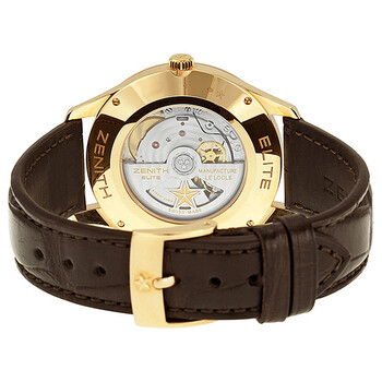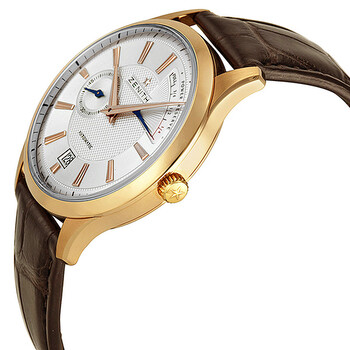 18kt rose gold case with a brown (alligator) leather strap. Fixed 18kt rose gold bezel. Silver dial with gold-toned dauphine-style hands and index hour markers. Minute markers around the outer rim. Dial Type: Analog. Luminescent hands and markers. Date display at the 6 o'clock position. Two sub-dials displaying: small second and power reserve indicator. Zenith calibre Elite 685 automatic movement, containing 38 Jewels, bitting at 28800 vph, and has a power reserve of approximately 55 hours. Scratch resistant sapphire crystal. Pull / push crown. Transparent case back. Round case shape. Case size: 40 mm. Case thickness: 10.2 mm. Band width: 20 mm. Band length: 6.5 inches. Tang clasp. Water resistant at 50 meters / 165 feet. Functions: date, hour, minute, small second, power reserve indicator. Captain Power Reserve Series. Luxury watch style. Watch label: Swiss Made. Item Variations: 18 2120 685/02 C498, 18-2120-685/02-C498, 18/2120/685/02/C498, 182120685/02C498. Zenith Captain Power Reserve Automatic Silver Dial Brown Leather Men's Watch 18.2120.685/02.C498.