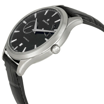 Silver-tone stainless steel case with a black alligator leather strap. Fixed silver-tone stainless steel bezel. Black dial with silver-toned hands and index hour markers. Minute markers around the outer rim. Dial Type: Analog. Date display at the 6 o'clock position. Two sub-dials displaying: small second and power reserve indicator. Zenith Calibre Elite 685 S automatic movement with a 50-hour power reserve. Scratch resistant sapphire crystal. Transparent case back. Round case shape, case size: 40 mm. Tang clasp. Water resistant at 50 meters / 165 feet. Functions: date, hour, minute, small second, power reserved. Captain Power Reserve Series. Luxury watch style. Watch label: Swiss Made. Item Variations: 03 2122 685/21 C493, 03-2122-685/21-C493, 03/2122/685/21/C493, 032122685/21C493. Zenith Captain Power Reserve Black Dial Automatic Men's Watch 03212268521C493.