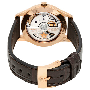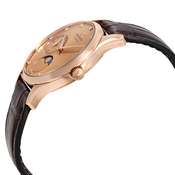 18kt rose gold case with a brown alligator leather strap. Fixed 18kt rose gold bezel. Rose gold-tone dial with rose gold-tone dauphine-style shape hands and diamond hour markers. Dial Type: Analog. Two - 60 second and moonphase subdials. Zenith Calibre Elite 692 Automatic movement, based upon Zenith Elite 670, containing 27 Jewels, bitting at 28800 vph, and has a power reserve of approximately 50 hours. Scratch resistant sapphire crystal. Pull / push crown. Transparent case back. Round case shape, case size: 33 mm, case thickness: 8.65 mm. Tang clasp. Water resistant at 30 meters / 100 feet. Functions: hour, minute, second, moonphase. Luxury watch style. Watch label: Swiss Made. Item Variations: 18 2310 692/95 C498, 18-2310-692/95-C498, 18/2310/692/95/C498, 182310692/95C498. Zenith Captain Ultra Thin Lady Moonphase 18kt Rose Gold Ladies Watch 18231069295C498.