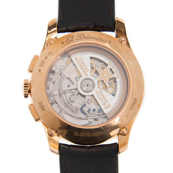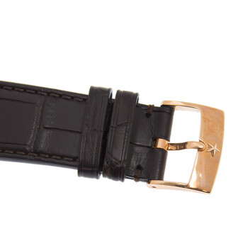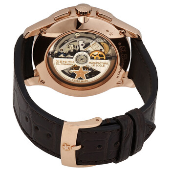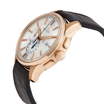 18kt rose gold case with a brown (alligator/crocodile) leather strap. Fixed 18kt rose gold bezel. Silver dial with rose gold-tone dauphine-style hands and index hour markers. Minute markers around the outer rim. Dial Type: Analog. Date display at the 6 o'clock position. Day of the week and month display at the 3 o'clcok position. Chronograph - two sub-dials displaying: 60 second, 60 minute. Zenith calibre El Primero 4054 automatic movement, based upon Zenith El Primero 400, containing 341 Jewels, bitting at 36000 vph, and has a power reserve of approximately 50 hours. Anti-reflective scratch resistant sapphire crystal. Pull / push crown. Transparent case back. Round case shape. Case size: 42 mm. Tang clasp. Water resistant at 50 meters / 165 feet. Functions: annual calendar, chronograph, column wheel, month, date, day, hour, minute, small second. Luxury watch style. Watch label: Swiss Made. Zenith Captain Winsor Chronograph Annual Calendar Men's Watch 18.2070.4054/02.C711.