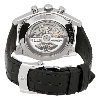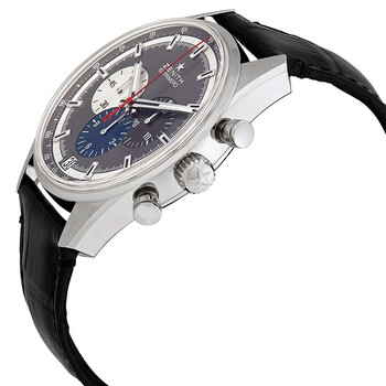 Stainless steel case with a black (alligator) leather strap. Fixed stainless steel bezel. Grey dial with luminous silver-tone hands and index hour markers. Minute markers. Tachymeter markings around the outer rim. Dial Type: Analog. Luminescent hands and markers. Date display at the 6 o'clock position. Chronograph - three sub-dials displaying: 60 second, 30 minute and 12 hour. Zenith calibre El Primero 400B automatic movement, based upon Zenith El Primero 400, containing 31 Jewels, composed of 328 parts, bitting at 36000 vph, and has a power reserve of approximately 50 hours. Scratch resistant sapphire crystal. Pull / push crown. Transparent case back. Round case shape. Case size: 42 mm. Case thickness: 12.75 mm. Band width: 22 mm. Deployment clasp. Water resistant at 100 meters / 330 feet. Functions: chronograph, column wheel, tachymeter, date, hour, minute, small second. Chronomaster El Primero Series. Luxury watch style. Watch label: Swiss Made. Zenith Chronomaster El Primero Chronograph Automatic Grey Dial Men's Watch 03.2040.400/26.C496.