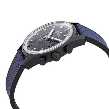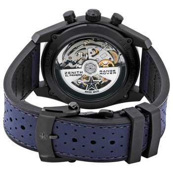 Black ceramic case with a blue calfskin leather strap. Fixed black ceramic bezel. Grey dial with silver-tone hands and index hour markers. Minute markers around the outer rim. Dial Type: Analog. Luminescent hands. Date display at the 6 o'clock position. Chronograph - three sub-dials displaying: 60 seconds, 30 minutes, and 12 hours. Zenith Calibre El Primero 400 Automatic movement, containing 31 Jewels, composed of 278 parts, bitting at 36000 vph, and has a power reserve of approximately 50 hours. Scratch resistant sapphire crystal. Transparent case back. Round case shape, case size: 42 mm, case thickness: 12.75 mm. Deployment clasp. Water resistant at 100 meters / 330 feet. Functions: chronograph, column wheel, date, hour, minute, small second. Luxury watch style. Watch label: Swiss Made. Zenith Chronomaster El Primero Chronograph Automatic Grey Dial Men's Watch 24.2040.400/27.R796.