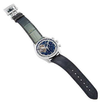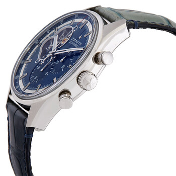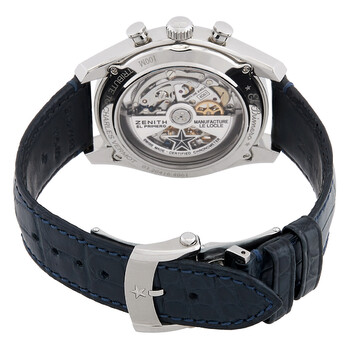 Stainless steel case with a blue (alligator) leather strap. Fixed stainless steel bezel. Blue (open heart display) dial with luminous silver-tone hands and index hour markers. Minute markers. Tachymeter markings around the outer rim. Dial Type: Analog. Luminescent hands and markers. Chronograph - two sub-dials displaying: 12 hour and 30 minute. Zenith calibre El Primero 4061 automatic movement, based upon Zenith El Primero 400, containing 31 Jewels, composed of 282 parts, bitting at 36000 vph, and has a power reserve of approximately 50 hours. Scratch resistant sapphire crystal. Pull / push crown. Transparent case back. Round case shape. Case size: 42 mm. Case thickness: 14.05 mm. Band width: 20 mm. Deployment buckle clasp. Water resistant at 100 meters / 330 feet. Functions: chronograph, tachymeter, column wheel, hour, minute, small second. Luxury watch style. Watch label: Swiss Made. Zenith Chronomaster El Primero Chronograph Automatic Men's Watch 03.20416.4061/51.C700.