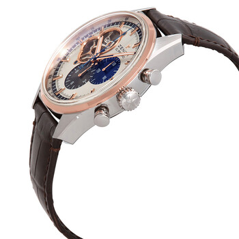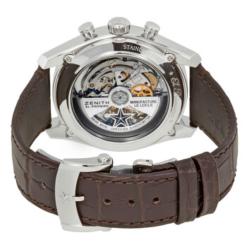 Stainless steel case with a brown (alligator) leather (rubber backed) strap. Fixed 18kt rose gold bezel. Silver dial (with a skeletal window) with luminous rose gold hands and index hour markers. Minute markers. Tachymeter markers around the outer rim. Dial Type: Analog. Luminescent hands and markers. Chronograph - two sub-dials displaying: 12 hour and 30 minute. Zenith calibre El Primero 4061 automatic movement, based upon Zenith El Primero 400, containing 31 Jewels, composed of 282 parts, bitting at 36000 vph, and has a power reserve of approximately 50 hours. Scratch resistant sapphire crystal. Pull / push crown. Transparent case back. Round case shape. Case size: 42 mm. Case thickness: 14.05 mm. Fold over clasp with a safety release. Water resistant at 100 meters / 330 feet. Functions: chronograph, column wheel, hour, minute, small second. Chronomaster El Primero Series. Luxury watch style. Watch label: Swiss Made. Zenith Chronomaster El Primero Chronograph Automatic Men's Watch 51.2080.4061/69.C494.