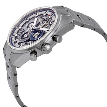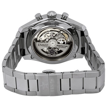 Silver-tone stainless steel case and bracelet. Fixed silver-tone stainless steel bezel. Skeleton dial with luminous silver-tone hands and index hour markers. Minute markers around the outer rim. Dial Type: Analog. Luminescent hands and markers. Date display at the 6 o'clock position. Chronograph - three sub-dials displaying: 60 second, 30 minute and 12 hour. Zenith Calibre El Primero 400B Automatic movement, based upon Zenith El Primero 400, containing 31 Jewels, composed of 328 parts, bitting at 36000 vph, and has a power reserve of approximately 50 hours. Scratch resistant sapphire crystal. Pull / push crown. Transparent case back. Round case shape, case size: 42 mm, case thickness: 12.75 mm. Band width: 22 mm. Fold over clasp with a push button release. Water resistant at 100 meters / 330 feet. Functions: chronograph, date, hour, minute, second. Chronomaster El Primero Series. Luxury watch style. Watch label: Swiss Made. Zenith Chronomaster El Primero Skeleton Dial Automatic Men's Chronograph Watch 03.2081.400/78.M2040.