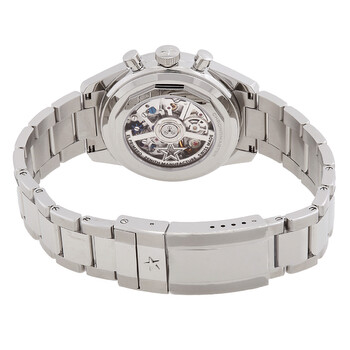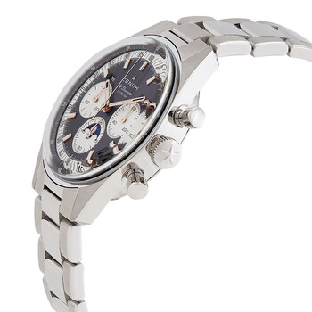 Silver-tone stainless steel case and bracelet. Fixed silver-tone stainless steel bezel. Slate grey dial with rose gold-tone hands and index hour markers. Minute markers around the outer rim. Dial Type: Analog. Luminescent hands and markers. Date display between 4 and 5 o'clock position. Chronograph - three sub-dials displaying: 60 second, 60 minute and small second. El Primero 3610 automatic movement with a 60-hour power reserve. Scratch resistant sapphire crystal. Transparent case back. Round case shape, case size: 38 mm. Water resistant at 50 meters / 165 feet. Functions: chronograph, day, date, month, hour, minute, small second, moonphase. Chronomaster Original Triple Calendar Series. Luxury watch style. Watch label: Swiss Made. Zenith Chronomaster Original Triple Calendar Automatic Slate Grey Dial Men's Watch 03.3400.3610/39.M3200.