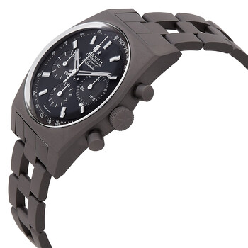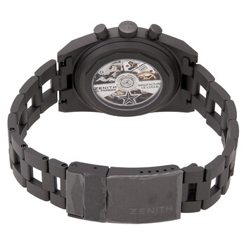 Matte microblasted titanium case and bracelet. Fixed matte microblasted titanium bezel. Black dial with index hour markers. Tachymeter markers around the outer rim. Dial Type: Analog. Luminescent hands and markers. Chronograph - three sub-dials displaying: 60 second, 30 minute and 12 hours. Zenith Calibre El Primero 400 Automatic movement, containing 31 Jewels, composed of 278 parts, bitting at 36000 vph, and has a power reserve of approximately 50 hours. Scratch resistant sapphire crystal. Pull / push crown. Transparent case back. Round case shape, case size: 37 mm, case thickness: 12.6 mm. Folding clasp. Water resistant at 50 meters / 165 feet. Functions: chronograph, hour, minute, second. Chronomaster Revival Shadow Series. Luxury watch style. Watch label: Swiss Made. Zenith Chronomaster Revival Shadow Chronograph Automatic Black Dial Men's Watch 97.T384.4061/21.M384.