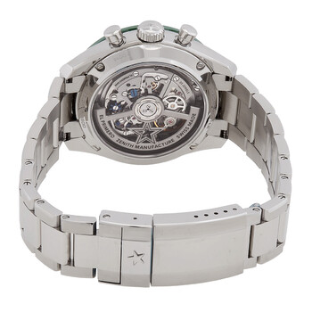 Silver-tone stainless steel case and bracelet. Fixed green ceramic bezel. Green dial with silver-tone hands and index hour markers. Minute markers around the outer rim. Dial Type: Analog. Date display between 4 and 5 o'clock position. Chronograph - three sub-dials displaying: 60 second, 60 minute and small second. Zenith Calibre El Primero 3600 Automatic movement, containing 35 Jewels, composed of 311 parts, bitting at 36000 vph, and has a power reserve of approximately 60 hours. Scratch resistant sapphire crystal. Transparent case back. Round case shape, case size: 41 mm. Water resistant at 100 meters / 330 feet. Functions: chronograph, date, hour, minute, small second. Chronomaster Sport Series. Sport watch style. Watch label: Swiss Made. Zenith Chronomaster Sport Automatic Green Dial Men's Watch 03.3119.3600/56.M3100.