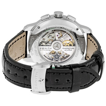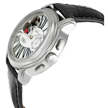 Polished stainless steel case with a black leather strap. Fixed stainless steel bezel. White mother of pearl dial with red heart skelton dispay, silver-tone hands and stylized Roman numeral hour markers. Minute markers around the outer rim. Luminescent hands and markers. Running seconds display set into skeleton cut-out. 30 minute sub-dial near the 3 o'clock position. Automatic movement. Scratch resistant sapphire crystal. Screw down crown. Skeleton case back. Case diameter: 37.5mm. Case thickness: 13.5 mm. Deployment clasp. Water resistant at 100 feet / 30 meters. Zenith Chronomaster Start Open Love Ladies Watch 031230402180C672.