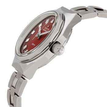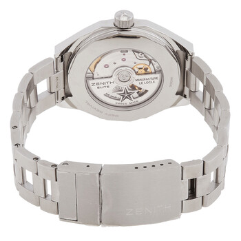 Silver-tone stainless steel case with a silver-tone stainless steel ladder bracelet. Fixed silver-tone stainless steel bezel. Ruby dial with silver-tone hands and batons hour markers. Minute markers around the outer rim. Dial Type: Analog. Luminescent hands and markers. Date display between 4 and 5 o'clock position. Zenith Calibre Elite 670 Automatic movement, based upon Zenith Elite 680, containing 27 Jewels, composed of 144 parts, bitting at 28800 vph, and has a power reserve of approximately 50 hours. Scratch resistant sapphire crystal. Screw down crown. Transparent see through case back. Round case shape, case size: 37 mm. Fold over clasp with a safety release. Water resistant at 30 meters / 100 feet. Functions: date, hour, minute, second. Defy Series. Sport watch style. Watch label: Swiss Made. Zenith Defy Automatic Unisex Watch 03.A3642.670/3691.M3642.