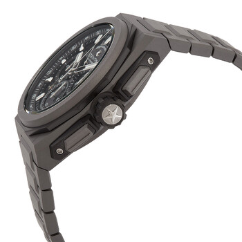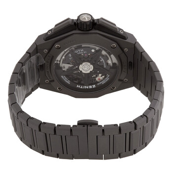 Grey (microblasted) titanium case and bracelet. Fixed grey (microblasted) titanium bezel. Skeleton dial with luminous silver-tone hands and index hour markers. Minute markers. 1/100th second markers around the outer rim. Dial Type: Analog. Luminescent hands and markers. Chronograph - three sub-dials displaying: 30 minutes, 60 seconds and small seconds. Zenith calibre El Primero 9004 automatic movement, containing 53 Jewels, bitting at 36000 vph, and has a power reserve of approximately 50 hours. Scratch resistant sapphire crystal. Screw down crown. Transparent case back. Round case shape. Case size: 45 mm. Case thickness: 15.4 mm. Band width: 28 mm. Fold over clasp. Water resistant at 200 meters / 660 feet. Functions: chronograph, hour, minute, second, power reserve. Defy Series. Luxury watch style. Watch label: Swiss Made. Zenith Defy Chronograph Automatic Men's Watch 97.9100.9004/02.I001.