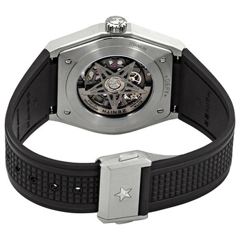 Brushed titanium case with a black rubber (FMK quality) strap. Fixed brushed titanium bezel. Skeletal dial with luminous silver-tone rhodium-plated hands and index hour markers. Minute markers around the outer rim. Dial Type: Analog. Luminescent hands and markers. Date display at the 6 o'clock position. Zenith calibre Elite 670 automatic movement, based upon Zenith Elite 680, containing 27 Jewels, composed of 144 parts, bitting at 28800 vph, and has a power reserve of approximately 50 hours. Scratch resistant sapphire crystal. Pull / push crown. Transparent case back. Round case shape. Case size: 41 mm. Case thickness: 10.75 mm. Band width: 22 mm. Deployment clasp with a push button release. Water resistant at 100 meters / 330 feet. Functions: date, hour, minute, second. Luxury watch style. Watch label: Swiss Made. Zenith Defy Classic Automatic Skeletal Dial Titanium Men's Watch 95.9000.670/78.R782.