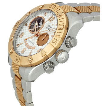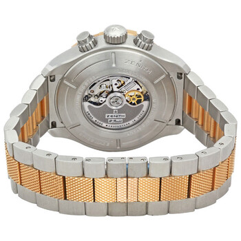 18kt rose gold/ steel case with a two-tone (silver-tone and gold-tone) 18kt rose gold/ steel bracelet. Graduated uni-directional rotating 18kt rose gold bezel. Silver dial with rose gold-tone hands and alternating stick and Arabic numeral hour markers. Minute markers around the outer rim. window on dial to view balance wheel. Dial Type: Analog. Luminescent hands and markers. Chronograph - sub-dials displaying: seconds sub-dial at 3 o'clock. Zenith Calibre El Primero 4021 Automatic movement, based upon Zenith El Primero 400, containing 39 Jewels, composed of 248 parts, bitting at 36000 vph, and has a power reserve of approximately 50 hours. Scratch resistant sapphire crystal. Screw in engraved with zenith logo crown. Skeleton sapphire crystal case back. Round case shape. Case size: 46.5 mm. Deployment clasp. Water resistant at 300 meters / 1000 feet. Functions: chronograph, hour, minute, second, power reserve indicator. Additional Info: 50-hour power reserve indicator. Luxury watch style. Watch label: Swiss Made. Item Variations: 86.0526.4021-01.M527, 86 0526 4021 01 M527, 860526402101M527. Zenith Defy Classic Open El Primero Men's Watch 86.0526.4021/01.M527.