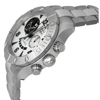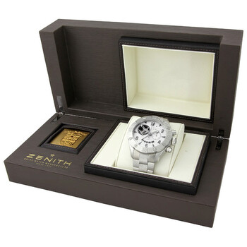 Stainless steel case with a stainless steel bracelet. Unidirectional rotating stainless steel bezel. Silver with skeletal display dial, skeletal hands and alternating index and Arabic numeral hour markers. Minute markers arond the outer rim. 30 minutes sub-dial. Power reserve display. Automatic movement. Scratch resistant sapphire crystal. Screw in case back with engraved with the Zenith Star Crown logo. Skeleton case back. Case diameter: 46.5 mm. Case thickness: 17.5 mm. Deployment clasp. Water resistant at 300 meters / 1000 feet. Zenith Defy Classic Open Stainless Steel Men's Watch 03.0526.4021.01.M526.