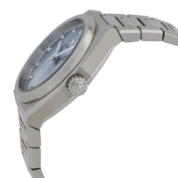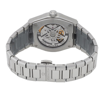 Silver-tone stainless steel case with a brushed & polished stainless steel bracelet. Fixed silver-tone bezel. Mother of pearl dial with silver-tone hands and diamond hour markers. Dial Type: Analog. Luminescent hands. Date display at the 3 o'clock position. Caliber 670SK automatic movement with a 50-hour power reserve. Anti-reflective scratch resistant sapphire crystal. Pull / push crown. Transparent case back. Round case shape, case size: 36 mm, case thickness: 10.35 mm. Push button deployant buckle clasp. Water resistant at 100 meters / 330 feet. Functions: date, hour, minute, second. Defy Midnight Series. Dress watch style. Watch label: Swiss Made. Zenith Defy Midnight Automatic Diamond Ladies Watch 03.9200.670/03.MI001.