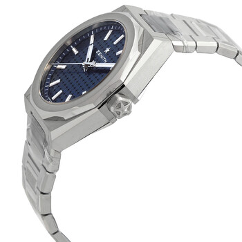 Silver-tone stainless steel case and bracelet. Fixed silver-tone stainless steel bezel. Blue dial with silver-tone hands and index hour markers. Dial Type: Analog. Luminescent hands and markers. Date display at the 3 o'clock position. Zenith Calibre Elite 670 Automatic movement, based upon Zenith Elite 680, containing 27 Jewels, composed of 144 parts, bitting at 28800 vph, and has a power reserve of approximately 50 hours. Scratch resistant sapphire crystal. Case size: 36 mm. Deployment clasp. Water resistant at 100 meters / 330 feet. Functions: date, hour, minute, second. Defy Skyline Series. Luxury watch style. Watch label: Swiss Made. Zenith Defy Skyline Automatic Blue Dial Ladies Watch 03.9400.670/51.I001.
